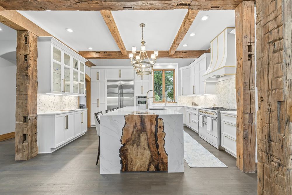 One of the significant updates for this French Country home was converting the outdated 1990s kitchen into a modern, functional area suitable for everyday use and entertaining large gatherings. This project included comprehensive electrical and plumbing work, new lighting and Amish-made cabinetry, refinished hardwood floors, and the replacement of all appliances and fixtures. A stunning range hood and brass inlaid marble backsplash enhances the overall space. The renovation maintained the rustic charm of the French Oak trim and historic barn beams, while a custom waterfall countertop with a Quartz base and Wormy Maple wood inlay was crafted by skilled artisans.