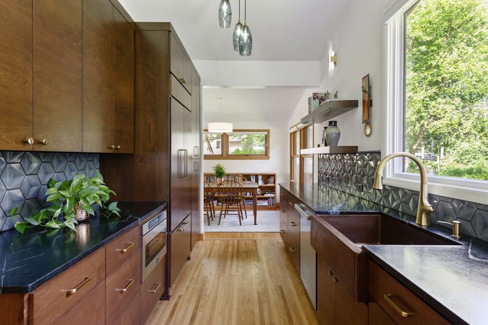 After living in their home for 40 years, the owners decided it was time to remodel. The remodeled kitchen, staircase, laundry room, and powder bath feature touches of Mountain West influence, inspired by the owner's upbringing on a ranch in northwestern Wyoming. Earthy color palettes, natural materials, and bold patterns are warm reminders of her first home.