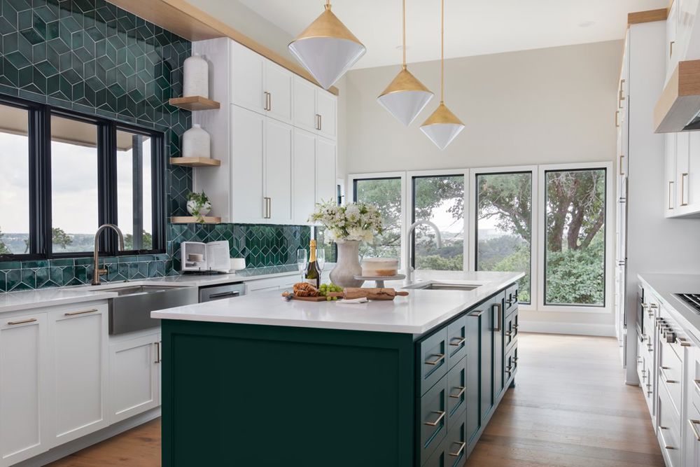 This 1970s hillside estate in Austin underwent a stunning kitchen transformation. The remodel modernized the space while preserving its original charm. Raising the ceiling to 12 feet and removing dividing walls created an open layout, while new windows and a glass door connected the kitchen to greenbelt views and brought in natural light. The design blends modern and transitional styles, featuring shaker cabinets, white oak accents, and a bold green island. Luxe gold fixtures and a handmade forest-green tile backsplash add elegance, making this kitchen the heart of the home.