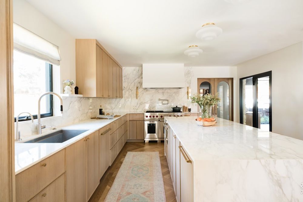 The clients wanted to transform their ageing, closed-off kitchen into a more open and modern space that matched their lively, hospitable lifestyle. The goal was to improve flow by opening one side of the kitchen to the living area and the other to an outdoor patio. The team began by reconfiguring the layout, demoing the old kitchen, and reframing the space. The project included custom shaker-style cabinetry, Calacatta marble countertops, a plaster range hood, and herringbone white oak flooring. New panel-ready appliances, trimless door and window frames, and custom storage solutions were installed to enhance both functionality and style.