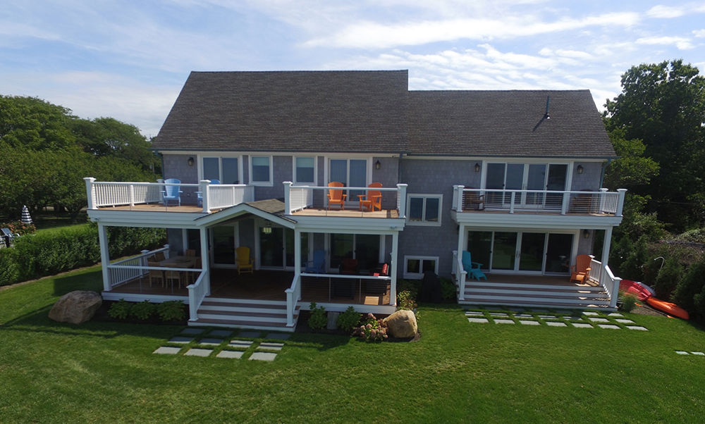 The homeowner wanted to keep their view of the water, while also giving each deck a feeling of privacy from the others. The decks were designed with a stainless steel cable rail on the front and Azek Reserved railing on the sides. This gave more privacy with a very nautical feel. Tongue and groove mahogany was used underneath the peaked roof. The main large lower deck was designed to entertain all year round. On each side of the peaked roof, there is a flat roof installed with hidden copper gutters, recessed lighting and ceiling fans. The space was finished with Azek beadboard.