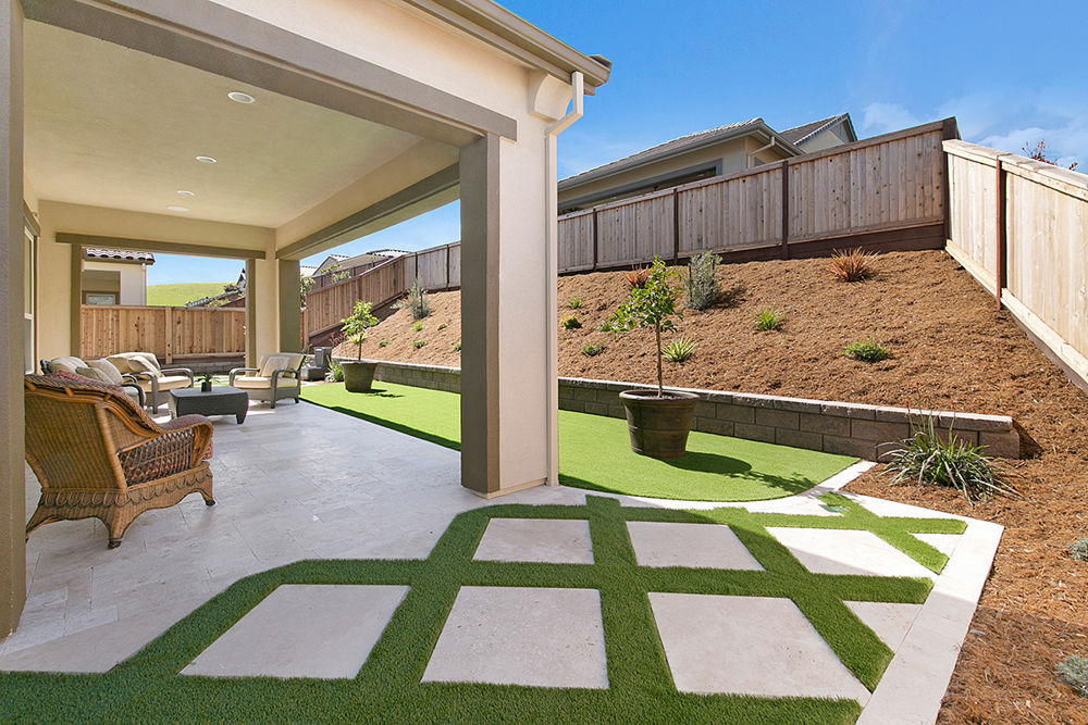 This backyard transformed from a blank slate to a beautiful landscape, and was designed for a new home in a 55 and up community. Low maintenance elements were installed throughout, including a synthetic lawn and drought tolerant planting. A key design element is the travertine pavers with the synthetic lawn in between. The space includes a bocce ball court with a hinged door push-to-open mechanism to easily access the area, which has a 4-inch high frame all the way around it. A water feature and small citrus trees were added as well.
