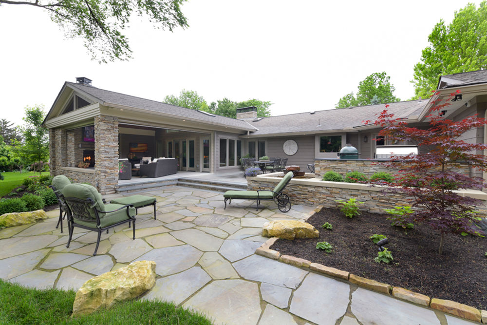 Our clients' goal was to extend their living space and create an outdoor oasis. This was accomplished by adding a covered porch with concealed phantom retractable screens. A stacked-stone fireplace, insulated ceiling and gas heaters allow the owners to comfortably use the porch late into the fall season. Their project also includes a two-level patio, a water feature, an outdoor kitchen and bocce ball court. This backyard transformation both extended the living space and provided a place for rest and relaxation.
