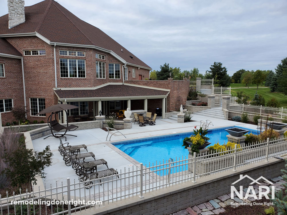 This client wanted his backyard to look like it belonged behind his home, include a safe way to move from the upper level to the backyard without coming through the house, a structure for shade and protection from mosquitoes, and a pool with features that reflect the quality of the home. Adding a covered screen room with individually controlled wall panels; a see-through fireplace; a staircase from the upper elevation; column and wall work; a fountain; a firepot feature; and a pool with sheer descent waterfalls fulfilled his expectations. The landscape was also reshaped, and existing piles of rocks were recycled into stone walls.