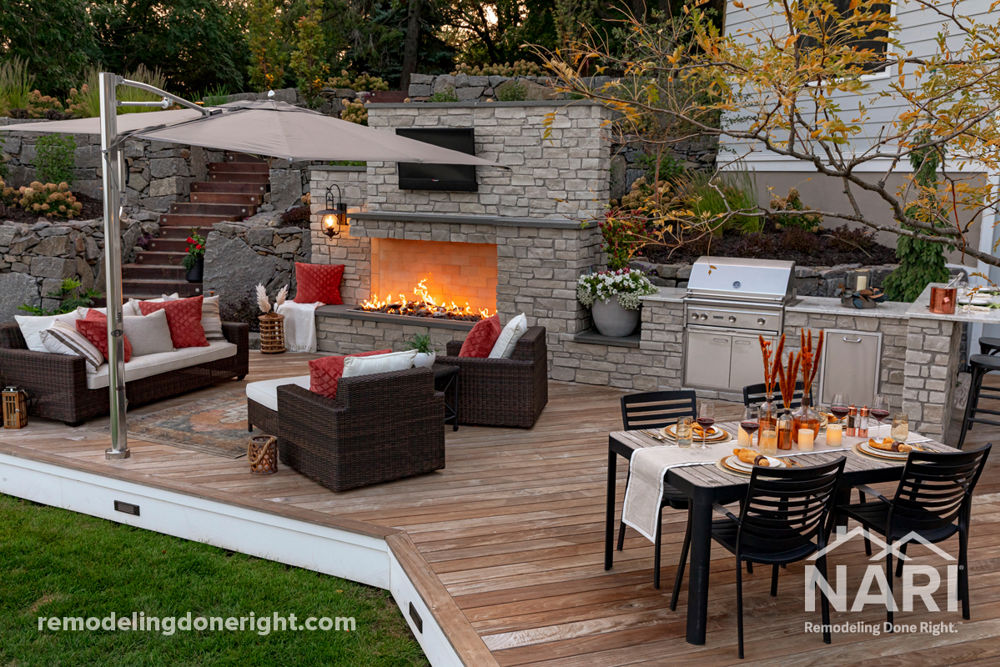 The clients were getting their forever home built and wanted a stunning outdoor space where they could relax and enjoy the lake views that complemented their new home. The lot had substantial grade change throughout, so the space was designed with that in mind to maximize their outdoor living and entertaining area. Many various complications were overcome, including tight access, a steep slope, a setback, hardcover, and height restrictions. The outdoor space now features gorgeous retaining walls, an Ipe deck, a modern fire feature, an adjustable umbrella, an outdoor kitchen area, a dining area and a private beach. This space truly has it all!