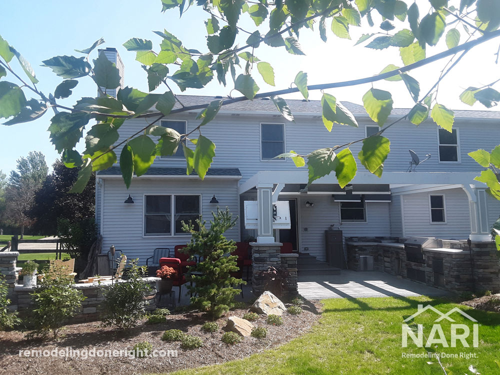 The existing wood deck was rotten and falling in. A new concrete patio/entertainment area was designed and built in that space in the midst of a back to nature landscape. A concrete stamped colored edge outlines the area, and includes a composite landing and steps. Stone column bases with sandstone caps, along with a stone enclosure for the inserted stainless-steel cabinets, a drop-in cooler and Hi-Tech smoker/grill combo unit, create the perfect outdoor BBQ. A retractable canopy system covers half the patio, while the wood burning gas fire pit was placed on the other side.