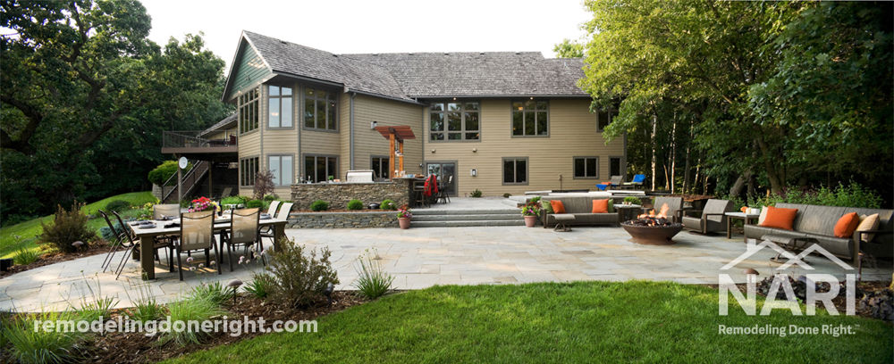 This million-dollar view is the perfect backdrop for the entertainment hub that matches the clients' lifestyle. Located high on a bluff overlooking the Mississippi River Valley, the clients' wish list included an outdoor kitchen, stainless steel spa/hot tub, fire pit, and dining space. The challenge was to create a unified entertainment hub from disconnected interior and exterior spaces. Their original main level deck and lower-level party room weren't connected, so they requested an entertainment space that takes advantage of the view and connects those spaces to maximize the entertainment areas.