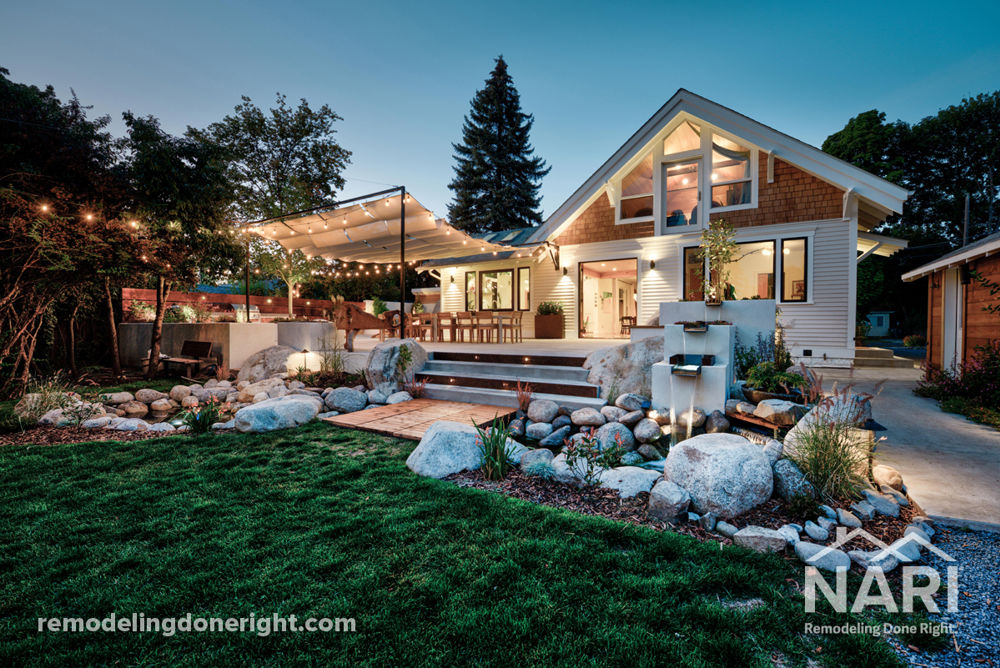 After completing their dream kitchen, this couple's focus shifted to planning what they have affectionately named the Party Patio. Located in the backyard, they wanted to create a personal playground for their children and friends to enjoy during their many events. This 1,800 spare-foot patio includes an outdoor kitchen, dining area, retractable shade sails, and multiple seating areas. Once the parties get going, their spa, fit pit, sauna, and lighting/sound packages are ready to go. Their drip irrigation, hydronic snowmelt system, and embedded boulders ensure the space is visually ready for everyday entertaining.