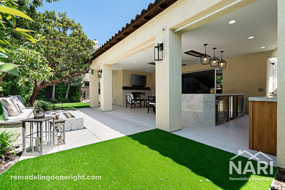 This homeowner wanted a lush outdoor living space that could be used year-round to host family and friends. By adding a welcoming kitchen with an eat-in island, dining space, and additional seating, this outdoor area is the perfect spot to entertain all day long.