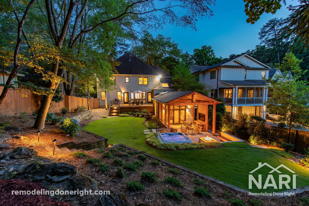 This outdoor living space needed to be renovated to transform into a comfortable, sheltered space to entertain, relax, and enjoy their backyard. A cedar-planked privacy wall was added by extending a vaulted roof over the patio area. The uncovered area of the patio includes space for a hot tub, fire pit, and built-in bench. The existing deck was reconfigured and updated with contemporary metal railings, making the entire space a modern addition to be enjoyed throughout all four seasons.