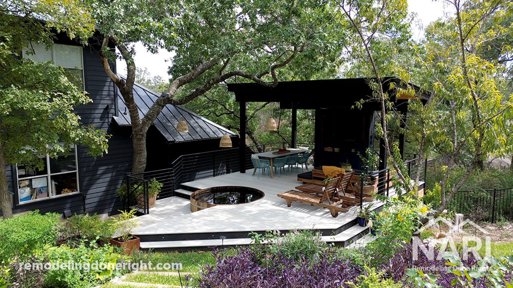 Focused on establishing a home for a custom spa, these homeowners dreamed of having their own outdoor living area. By expanding the original footprint, the new space now offers ample seating, overhead coverage, and an easy path to the spa. Wood features and the warm deck and pergola stain allow the space to blend seamlessly with its surroundings, while open walls embrace the fresh air. The end result is a carefully crafted space with enough room for the entire family to enjoy this backyard dream.