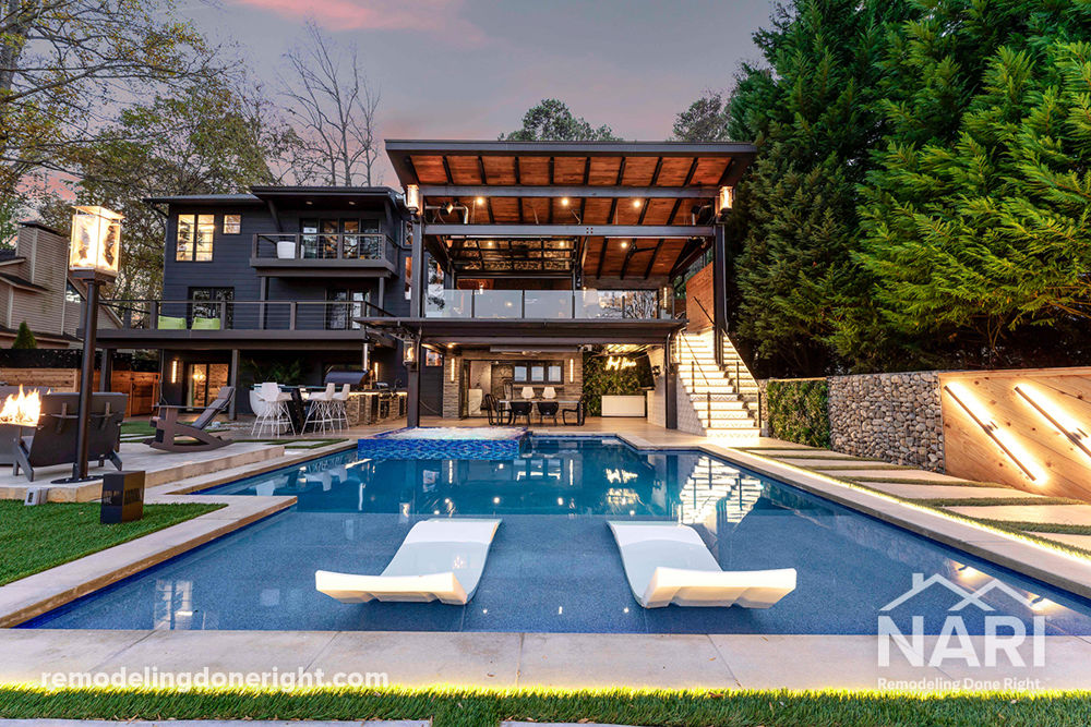 These homeowners are host extraordinaires and wanted the perfect all-season gathering place for large family events and weekend dinner parties. This waterfront property now boasts striking design features to impress guests while also providing a comfortable place for everyday activities. The outdoor living area incorporates unique, discrete seating areas that connect seamlessly with the outdoor kitchen, indoor/outdoor bar, jacuzzi, pool, and fireplace to facilitate entertaining while remaining a tranquil space for an intimate outdoor meal, reading by the pool, playing fetch with the dogs, or walking out on the pier to enjoy lakeside living!