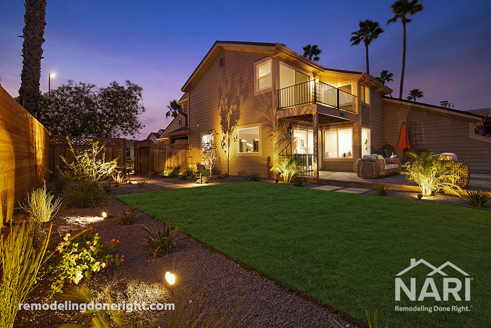 Tenants had left the backyard in disarray, prompting the homeowner to seek a sophisticated and functional transformation. The aging deck, coupled with eroding foundations, posed safety hazards. A refined design featuring a synthetic lawn, Belgard Catalina Grana paver patio with a hog wire guard rail, contemporary horizontal fencing, new planting, and lighting provided a real transformation. Essential to the project's success, a newly installed retaining wall beneath the deck combats erosion while enhancing structural stability. This thoughtful and modern makeover not only addresses safety concerns but also creates an inviting, functional outdoor space that harmonizes aesthetics with durability, embodying timeless refinement.