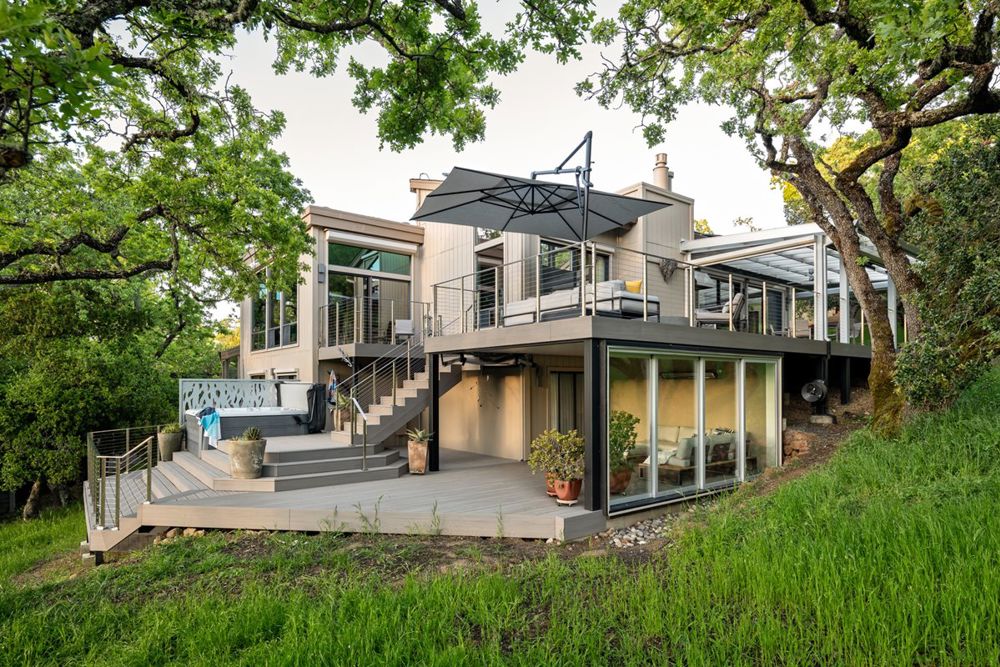 A retired couple in a high-risk fire community wanted to replace their aging redwood decks with a fire-resistant, multi-level outdoor living space. The new design combines safety with luxury, featuring amenities such as glass canopies, heaters, a fan, and retractable insect screens. Additional spaces feature a fire pit, hot tub, shower, and an aptly named 'weather room,' protected on three sides with a view of the nearby hills on the fourth. The front entry deck got a similar makeover, and a wheelchair-accessible walkway connects the two. The design demonstrates that protecting against fire can enhance both safety and aesthetics.