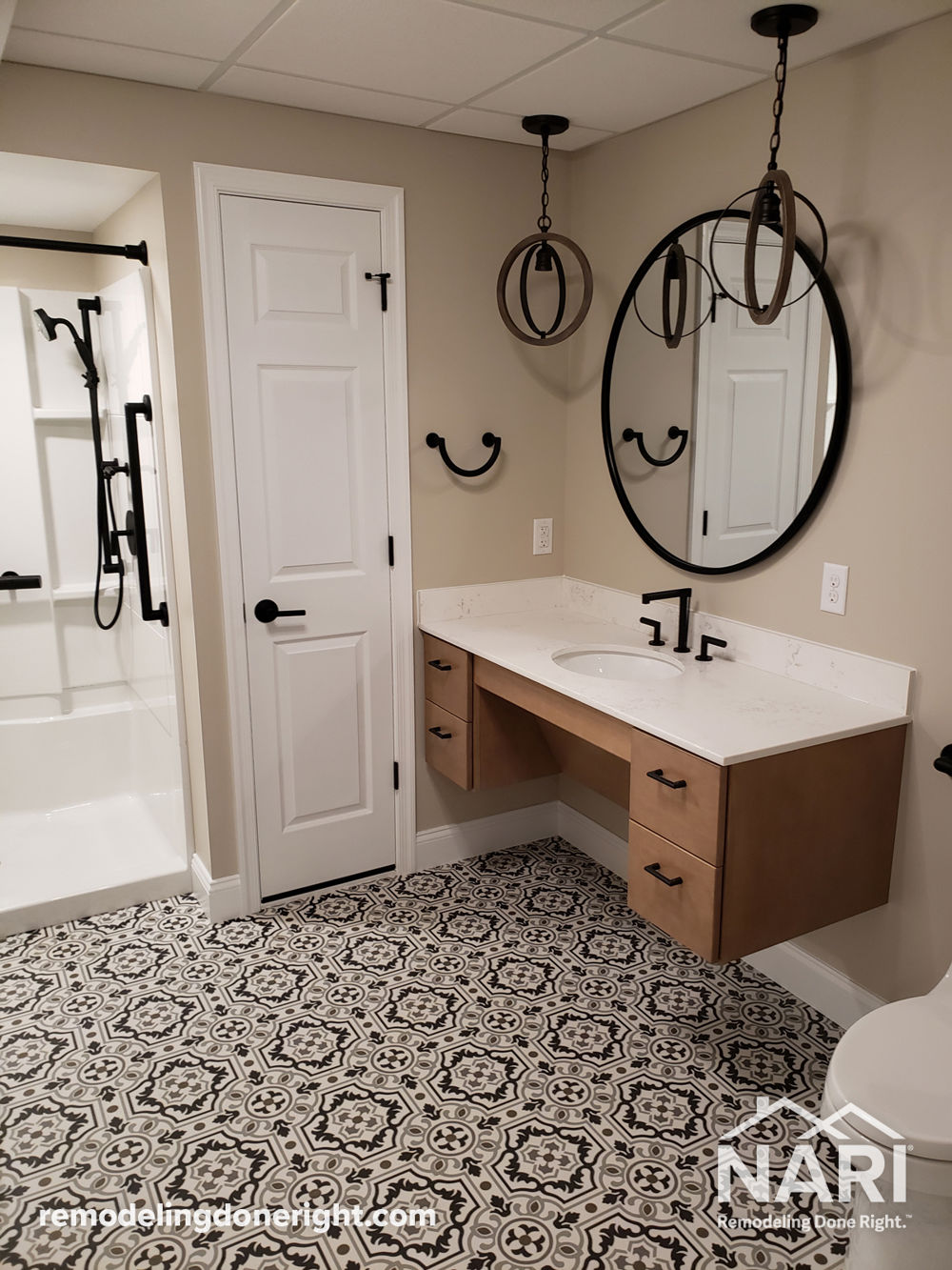 The clients have a pool in their back yard and wanted to upgrade their walkout basement to include an additional bathroom that would be accessible to a family friend confined to a wheelchair. The utility room was turned into a new accessible bathroom with a modern design. The black fixtures and pattern flooring as well as hanging vanity lights set this bathroom apart without making it look accessible.