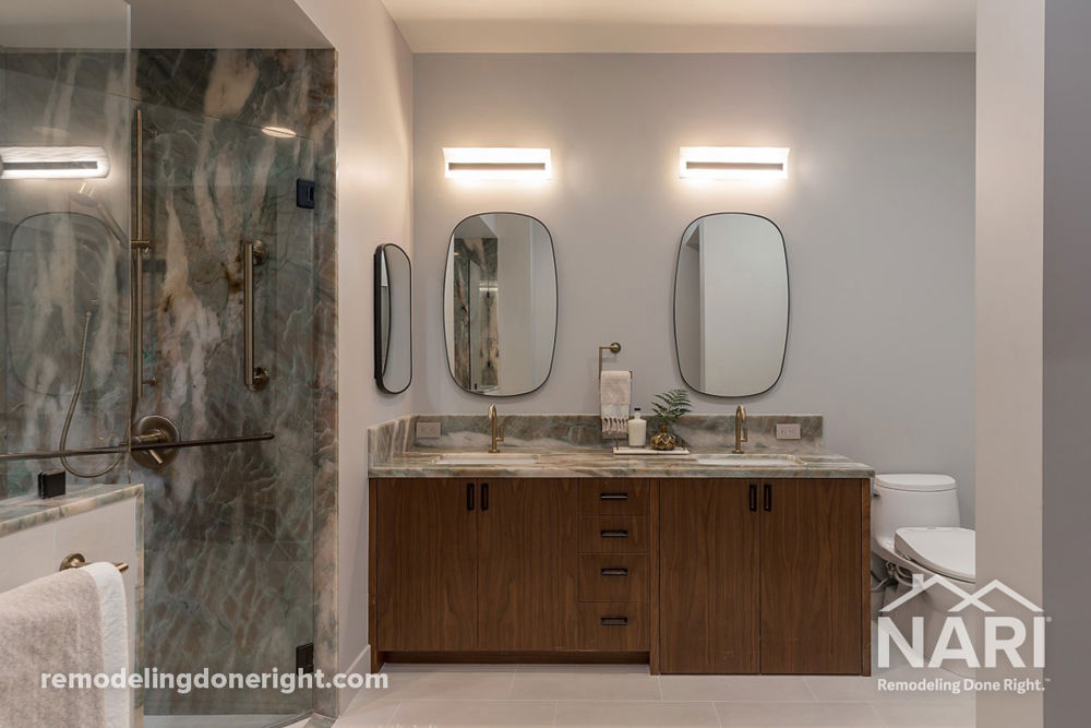 The master bath in this penthouse needed a universal design update to accommodate a homeowner with limited mobility. The goal was to create a luxurious, obstacle-free space for the homeowner to easily navigate with access to basic bathroom functions. Because of the home's twenty-second floor location, all changes had to remain within the existing footprint and plumbing locations could not change. The tub space was converted into a curbless walk-in shower with quartzite shower walls, a built-in bench, hand-held shower, and easy-reach grab bars. The custom walnut vanity includes one set of doors that fully retract, providing full access to the vanity sink, and gold-tone faucet fixtures with touchless technology.