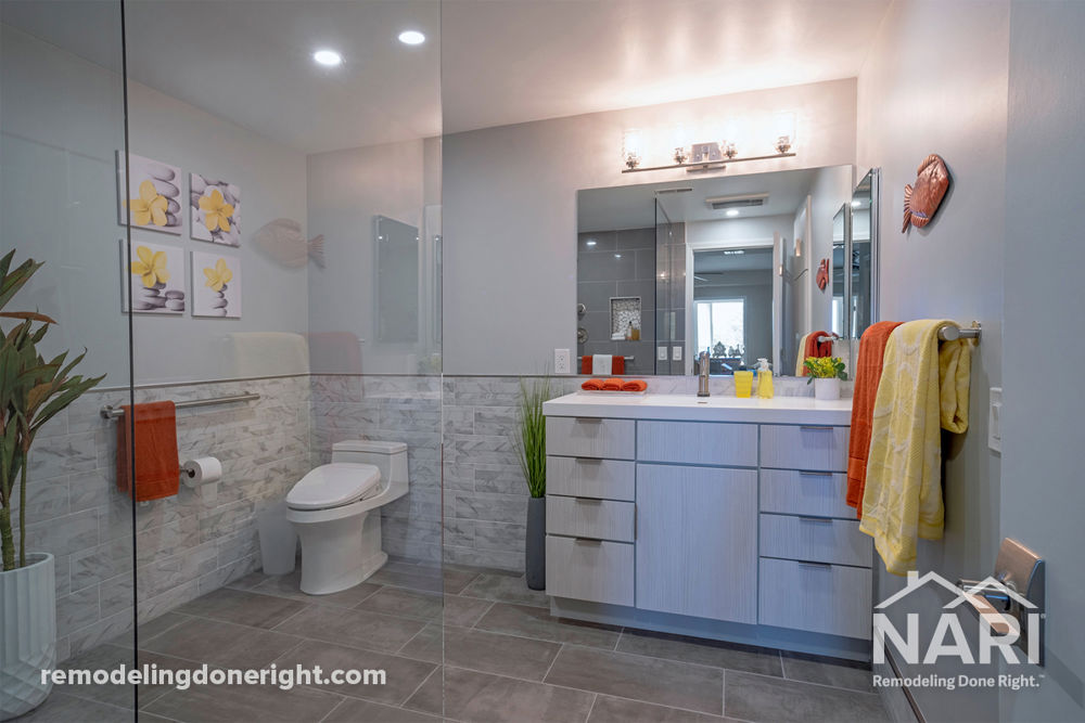 Incorporating Universal Design techniques tailored this bath into a practical room for the caregivers who assist other family members with wheelchairs and shower chairs. A warm, soothing shower, calming colors, and organic textures turned this bathroom into an open, bright, cheerful place of repose. Contemporary features like a curb-less shower with large glass shower walls, a touch-activated faucet, a bidet seat and plenty of storage serve the needs of this loving family.