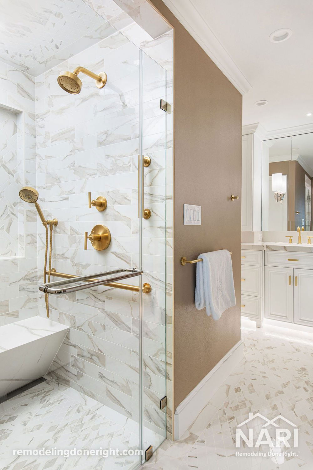 This couple aimed to update their primary bathroom with universal design elements to ensure they could age comfortably in their home. The vanity was enlarged to account for both of their grooming habits and more point-of-use storage, and a separate toilet room allowed for increased privacy. This created a responsive space finished with sophistication and elegance.