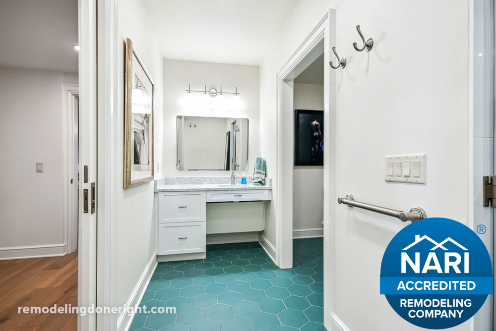 These clients purchased a beautiful home to settle in to, but needed some accessibility upgrades. One of the homeowners uses a wheelchair, and in addition, an elderly parent was coming to live with them as well. This accessible bathroom plans for both current and possible future needs. Bright colors suit our clients tastes, and luxury finishes keep the space from feeling too institutional.