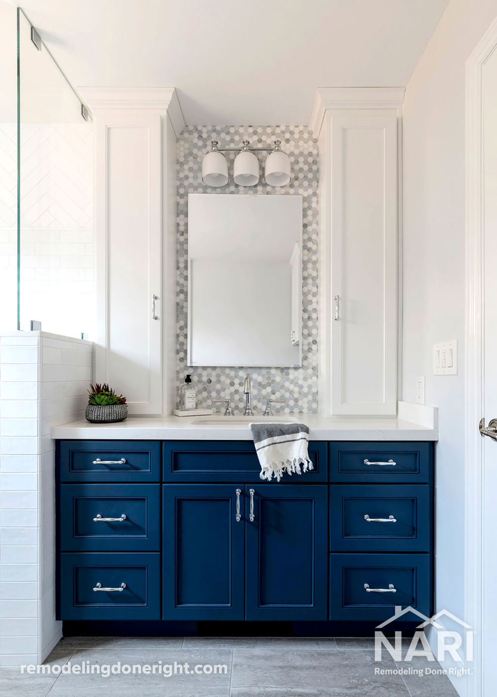 These homeowners had a goal of creating a bathroom that would allow them to age in place. In the near future, they were undergoing some surgeries which would require them to have a bathroom that would properly assist in their recovery. A barrier free shower with handheld shower heads at two locations was put in for ease of use. All flooring is slip-resistant and easy to clean. The idea was to create a beautiful bathroom that didn't look like a sterile or hospital like environment. Decorative grab bars have been installed throughout the bathroom.