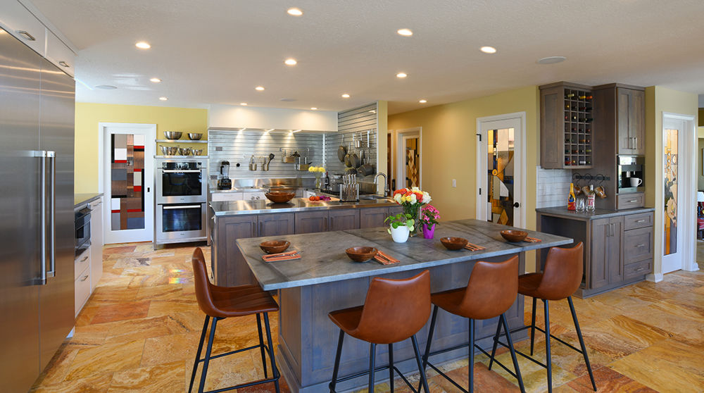 Phase two of a whole house renovation involved reconfiguring the kitchen to provide universal design function so our clients could age in place. Removing a load bearing wall between the kitchen and an underutilized nursury made room for this wheel chair accessible design. The kitchen incorporates elements and functions of a commercial kitchen along with the comforts of a residential kitchen in a traditional setting. Universal Design elements, including a 3-foot wide pantry door, roll-up eating counter, non-slip tile floor, touch faucets, a slat wall hanging system, adjustable open shelving and easy acess cabinets, help meet current and future accessibility needs.