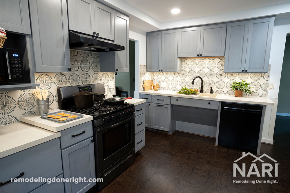 Once dreary, this hard-working little kitchen is now bright and inviting, with many hidden surprises. Mom uses a wheelchair, so countertops, her cooktop, and electrical devices were lowered in height. There's a roll-under sink with a deck-mounted faucet handle within everyone's reach. The gas range is a normal height for dad and daughter to stand, but controls are on the front for mom to use the oven. And she loves the pull-down and pull-out shelves. Cabinets with slow-close drawers and doors take little effort and tolerate grandkids searching for treats.