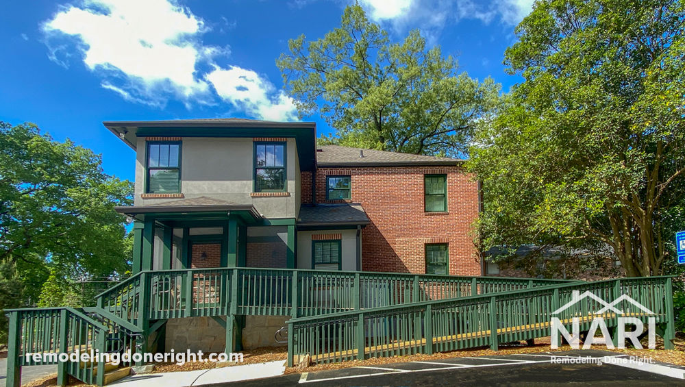A historic 1940s home was converted into a group home for functioning adults with developmental disabilities and their caretakers. The modern face-lift includes a 60-foot accessible ramp, whole-house sprinkler system, front porch, screened back porch, a wheelchair accessible bathroom and kitchen, and energy efficient components, including a tank-less water heater. Hallways and entryways were widened without compromising surrounding spaces and rooms were creatively converted to add three more bedrooms and an extra bathroom. Accessibility was a key component in this design. The practicality and comfort in this home make it truly one of a kind.