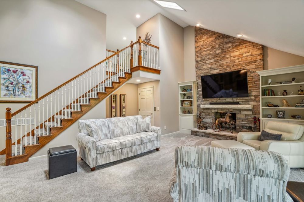 This gorgeous two-story house overlooking a golf course became a forever home for the clients who winter in the south but spend the warm weather months in Central Ohio. By adding an elevator, not only is the second floor fully accessible, but the first floor has been upgraded as well. With some structural changes and a relocated stairwell, the new elevator shaft was successfully incorporated into the existing floor plan. This was a much less expensive option than a primary suite addition and gave the opportunity for cosmetic updates to the loft and living room as well.