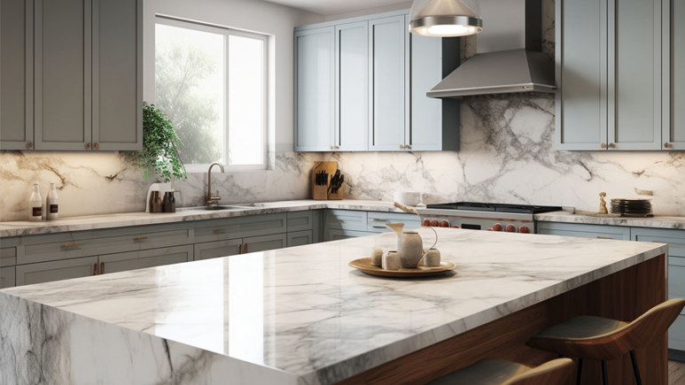Calacatta marble is a favored choice for high-end bathrooms and kitchens. A rare and expensive marble variety, it features a distinctive white background with dramatic grey veining, creating a stunning visual impact.
